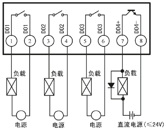 4路,其中D01、D02、D03为电磁继电器,D04为光耦输出 |